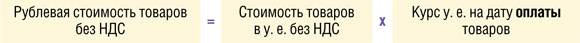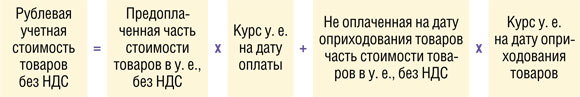 Для целей бухгалтерского и налогового учета стоимость импортированных белорусских товаров, цена которых выражена в условных единицах, считается не так, как база по «импортному» НДС. Универсальная формула для определения их учетной стоимости така