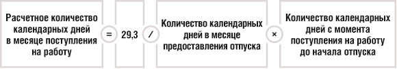 •если к моменту отпуска работника ему уже будет начислена зарплата за отработанные в месяце предоставления отпуска дни — то исходя из суммы начисленной зарплаты. Для этого сначала найдите расчетное количество календарных дней в месяце поступления на работу как в не полностью отработанном по формуле: